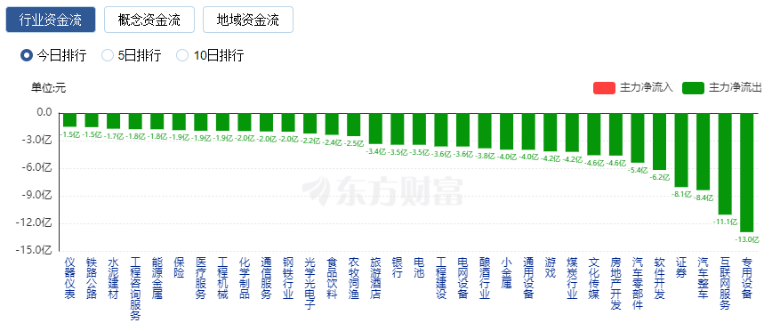 净流出方面,专用设备、互联网服务等排名靠前,其中专用设备净流出13亿元。