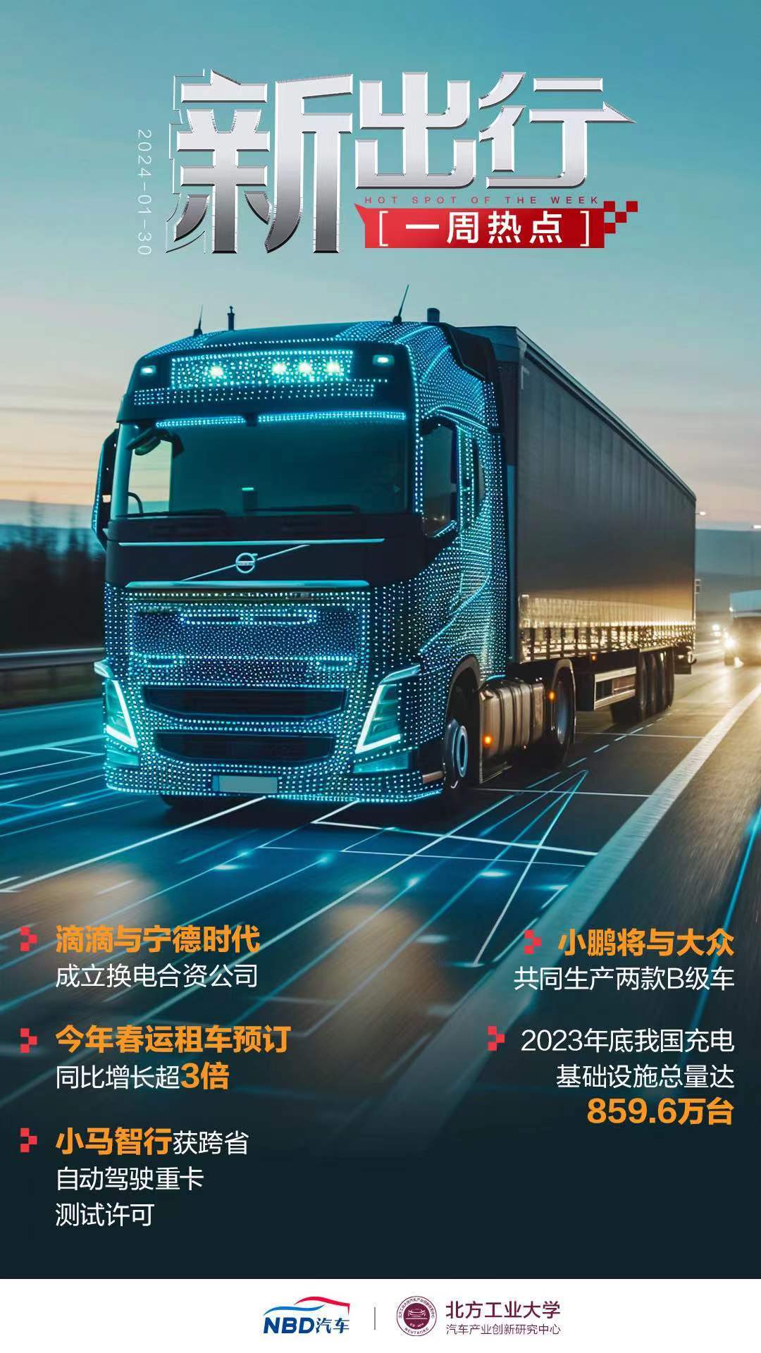 NO.5【滴滴与宁德时代成立换电合资公司】1月26日,滴滴与宁德时代在福建省宁德市宣布正式成立换电合资公司。换电合资公司将从网约车场景切入,为众多新能源车辆提供换电服务。除成立换电合资公司之外,宁德时代还与滴滴旗下小桔能源形成战略合作意向,将推动在储充一体等更广泛新能源领域的合作。